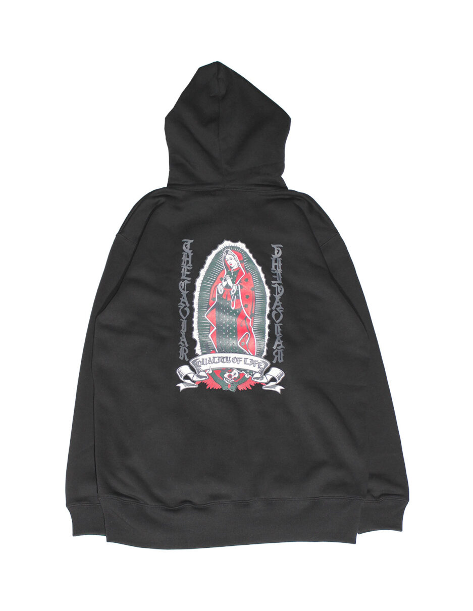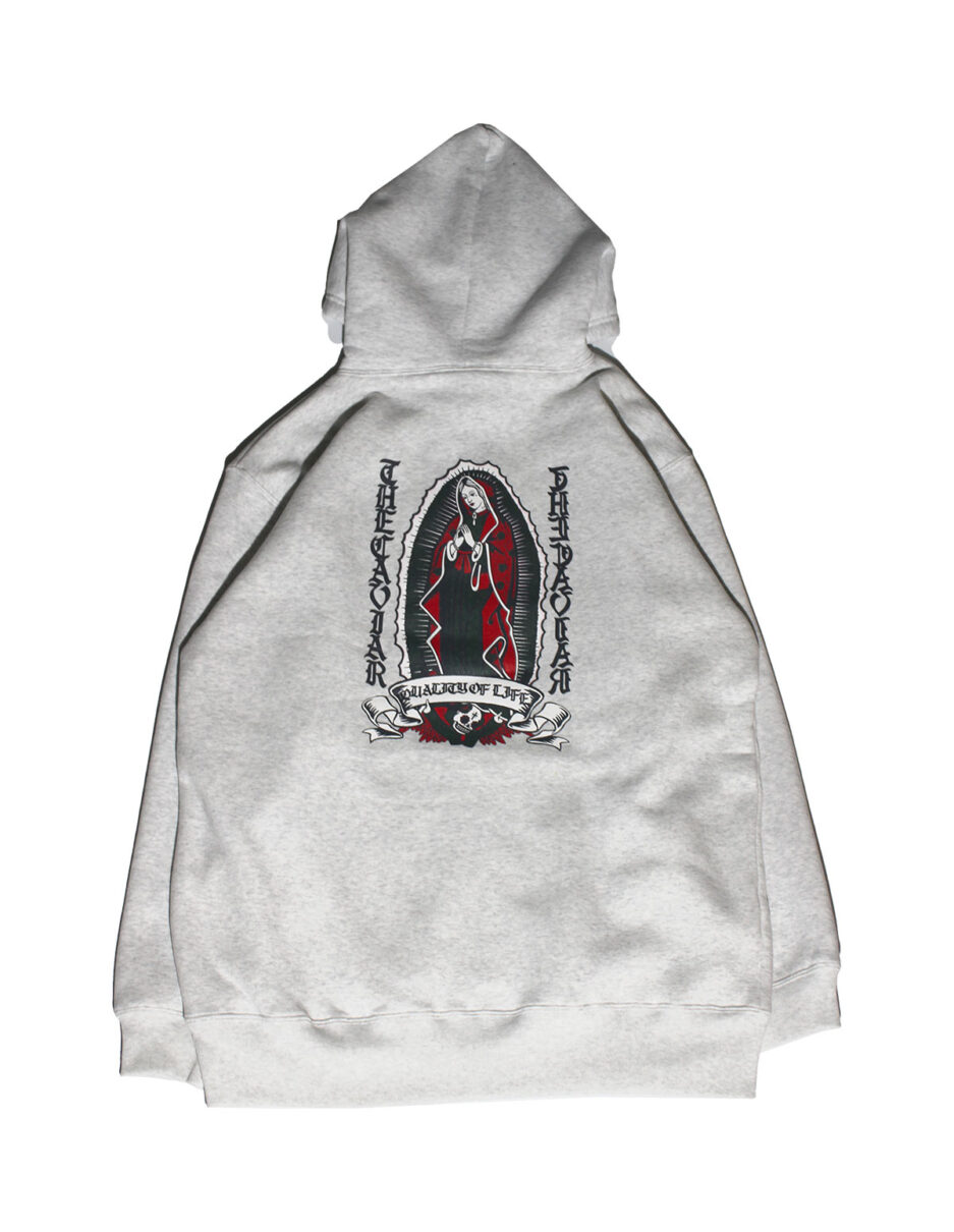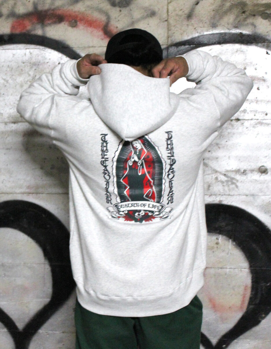 10オンスの裏起毛スウェット素材を使用したプルパーカー。大き目のフードは被って着こなしてもスタイルがきまる一枚です。フロントはシンプルに、バックには大胆に新作グラフィック“GUADALUPE”がプリントされる完売必至のアイテムです。