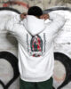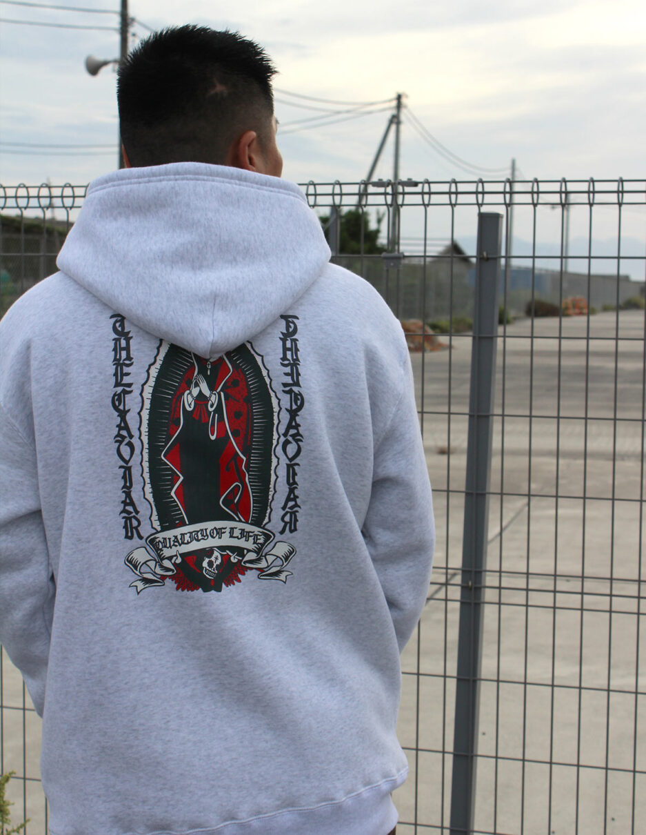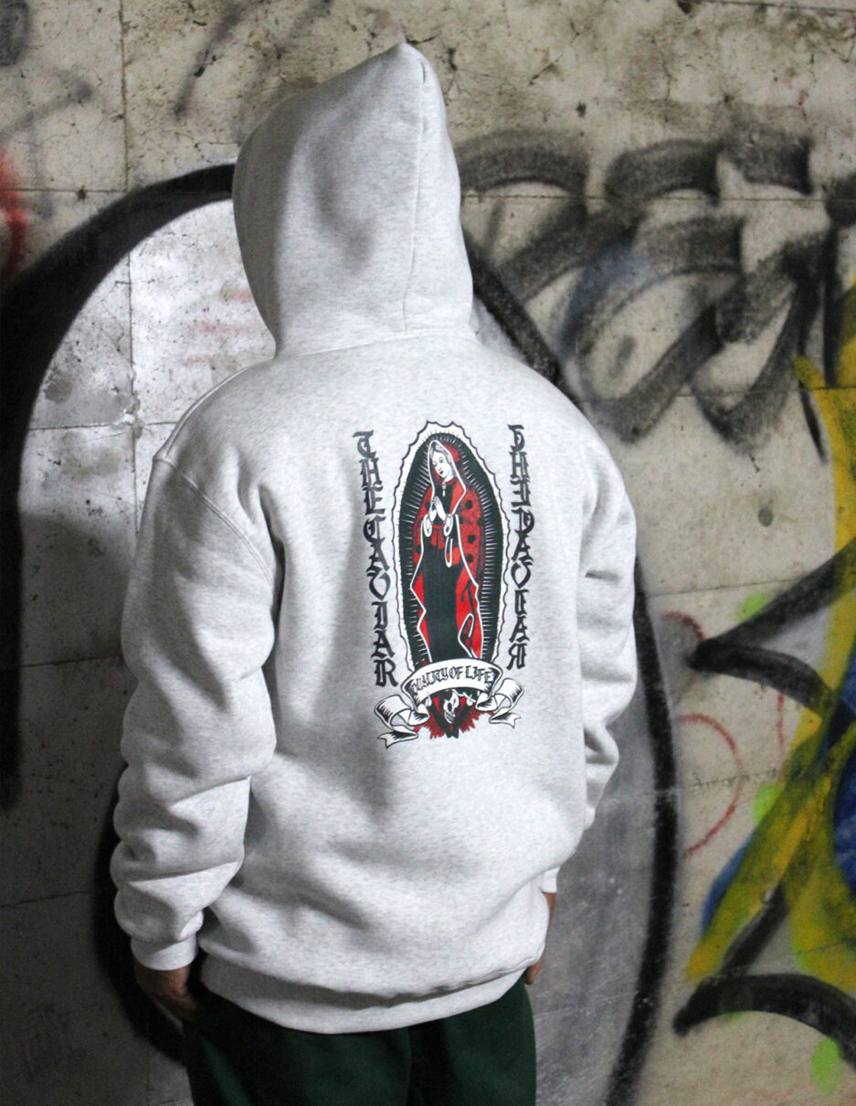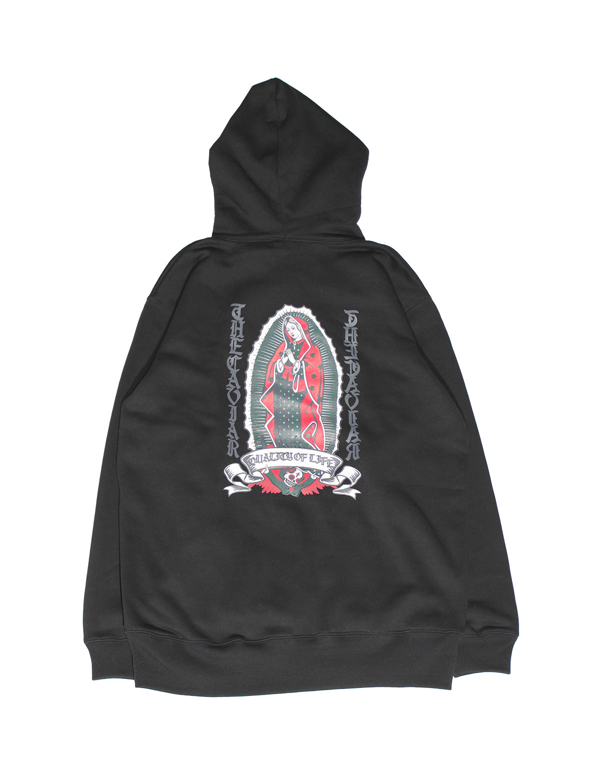10オンスの裏起毛スウェット素材を使用したプルパーカー。大き目のフードは被って着こなしてもスタイルがきまる一枚です。フロントはシンプルに、バックには大胆に新作グラフィック“GUADALUPE”がプリントされる完売必至のアイテムです。